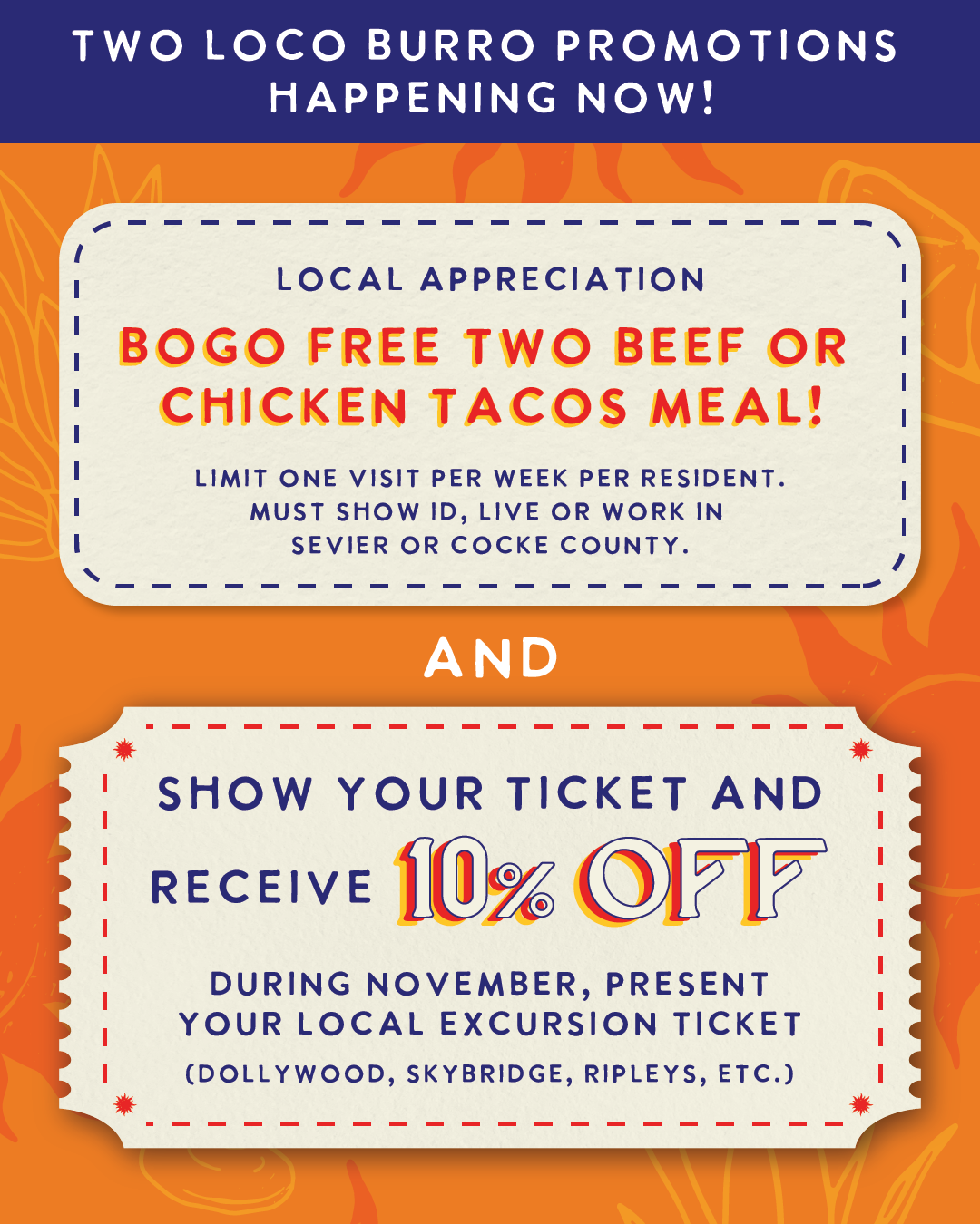 LOCO for our locals! We are so crazy about you all that we’ve decided to give you BOGO two-taco meals (beef or chicken) ALL November long!🙌